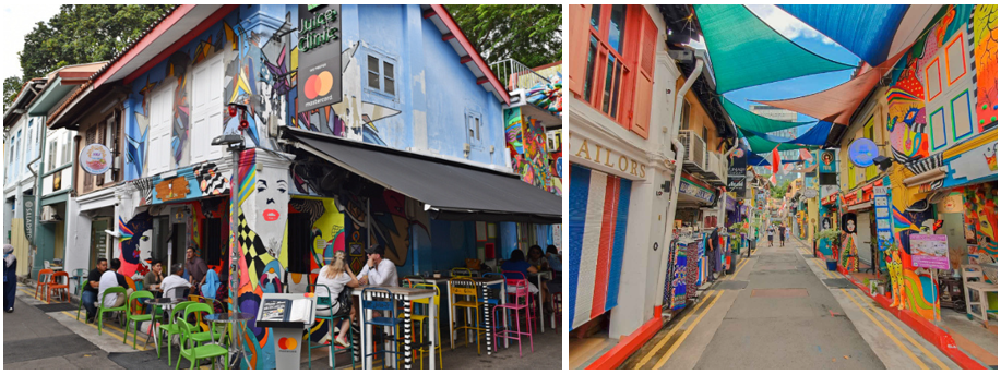 싱가포르 하지 레인은 알록달록한 색을 가진 건축물들이 빼곡히 모여있는 거리입니다. 기념사진을 찍기 좋고 지나다니다 힘들면 아무 카페나 가서 목을 축일 수 도 있습니다.