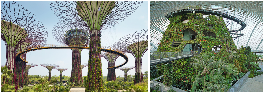 가장 유명한 슈퍼트리 구조물 앞에는 정원을 관통하는 스카이워크가 있으며 온실 정원에는 동남아가 아닌 추운 산악 기후를 가진 지역에서 볼 수 있는 수천 가지의 나무와 식물도 관람할 수 있습니다.