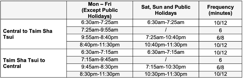 - 침사추이와 완차이 선착장에서 출발하는 첫차는 07:20분과 07:30분입니다.